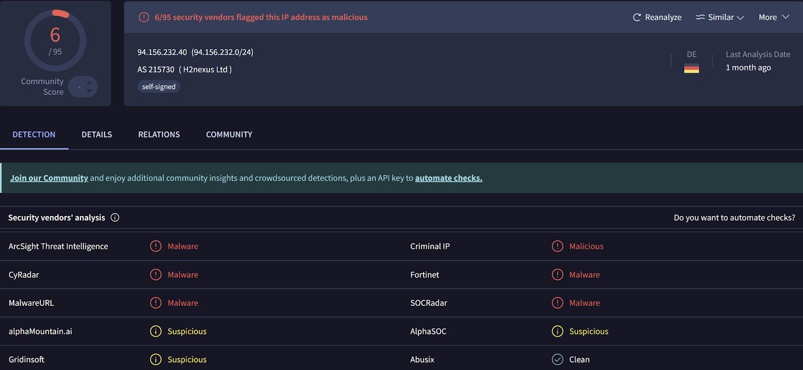 Figure 2: VirusTotal response for the IP address 94.156.232[.]40