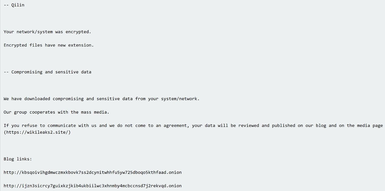 Figure 4 illustrates an excerpt of a Qilin ransom note found on the endpoint.