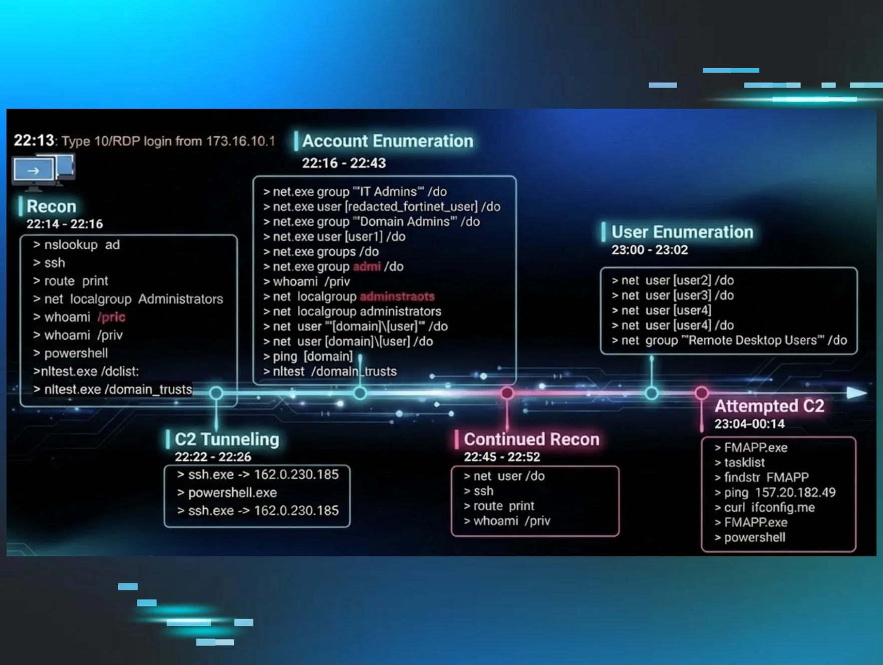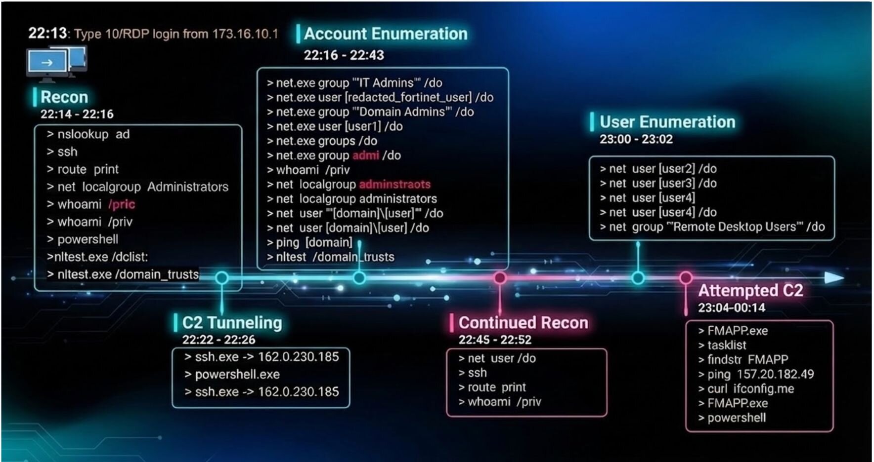 The initial access to the endpoint was achieved through a Terminal Services/RDP login. A timeline excerpt developed from detection data appears as follows: