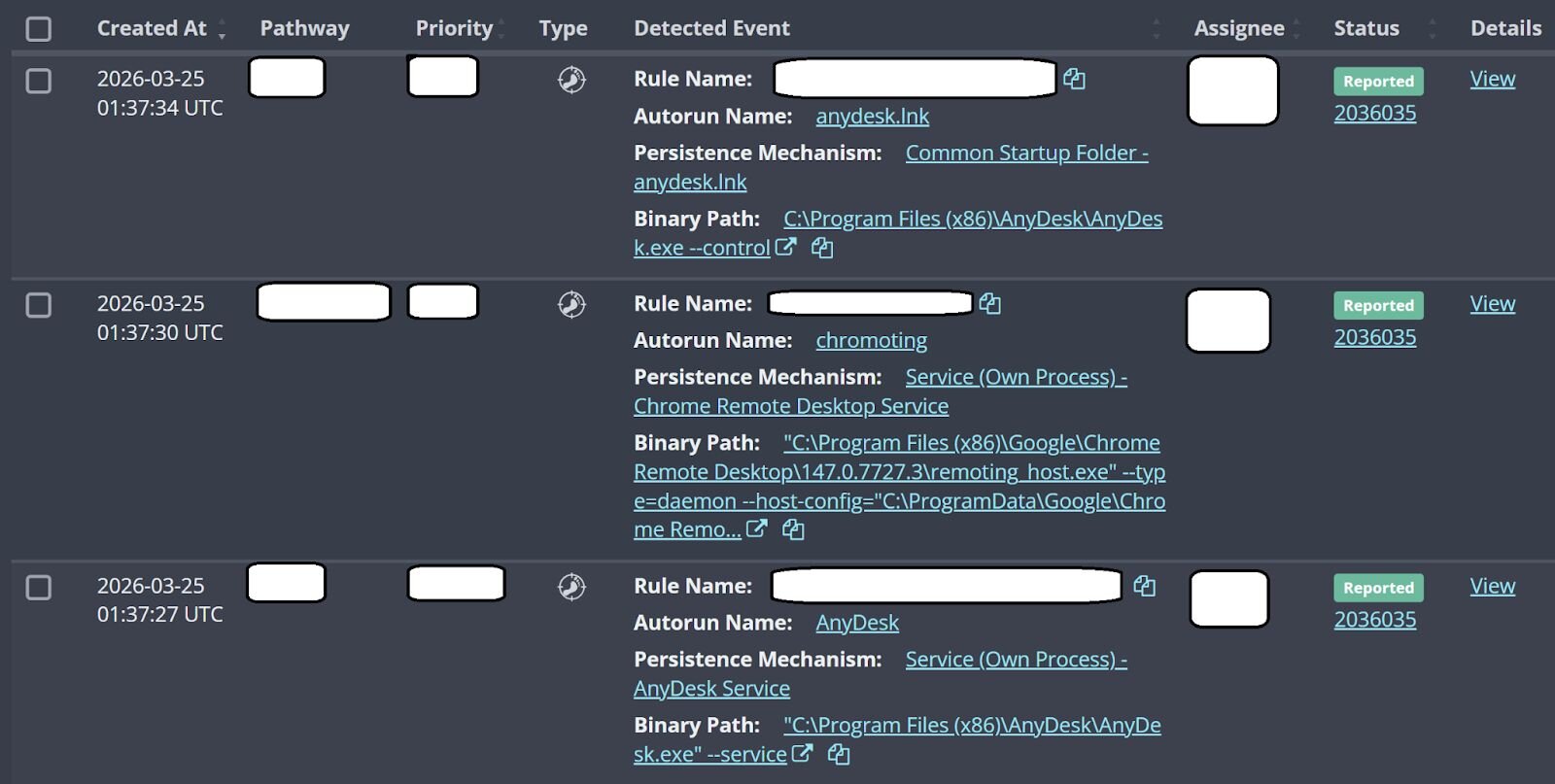 On a second endpoint within the infrastructure, as illustrated in Figure 2, foothold signals for Chrome Remoting Desktop and AnyDesk were generated shortly after the Huntress agent was installed.