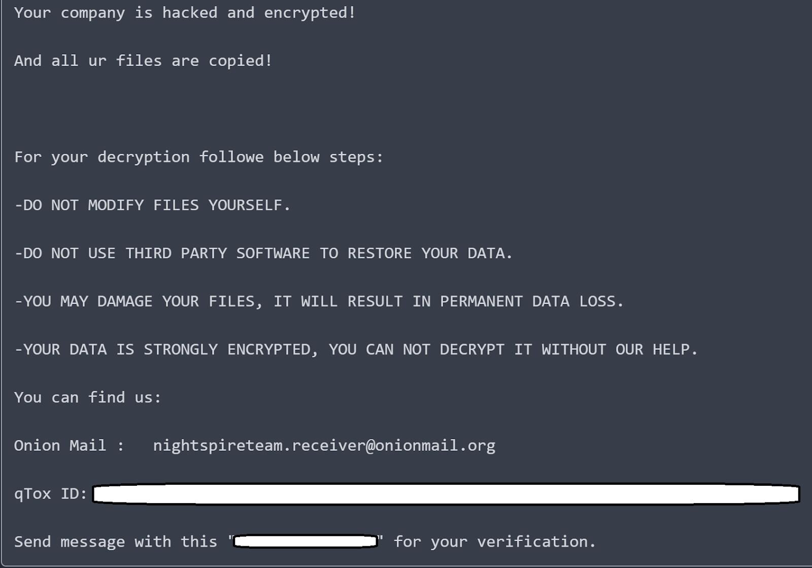 NightSpire ransomware was reportedly first discovered in February 2025, and was active throughout the year. There appears to be some confusion as to whether or not NightSpire follows a ransomware-as-a-service (RaaS) model or not. Researchers with Halcyon have argued that the actors are keeping their operations in-house, stating in a July 2025 post, “They’re not running a public RaaS operation, and there’s no affiliate program; it’s a closed shop.” However, two months later, further reporting from HivePro indicates that the attackers are “operating under a Ransomware-as-a-Service (RaaS) model”.