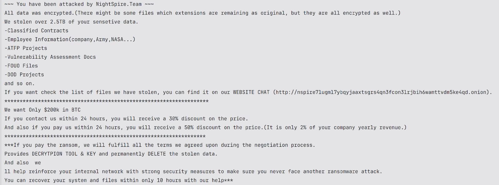 It turns out that this wasn’t the first time Huntress had seen a customer environment where the NightSpire ransomware had been deployed. During this incident, there was not a great deal of data related to the threat actor TTPs captured, but it was noted that encrypted files had the .nspire extension added to them, and a copy of the _nightspire_readme.txt ransom note was retrieved from one of the endpoints.