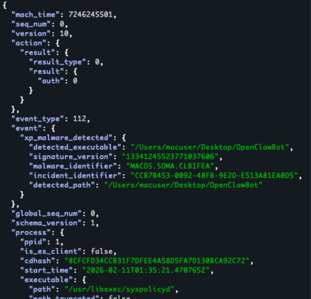 Figures 24 & 25: XProtect.yara rule to detect OpenClawBot and xp_malware_detected ES event JSON output supplied by eslogger detailing enforcement of this rule.