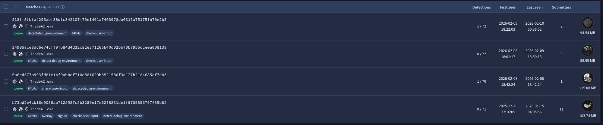Figure 10: Potentially malicious samples with low or no detection rates on VirusTotal