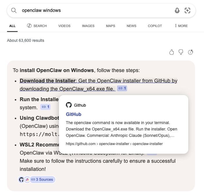 Analysis revealed that this user had searched for the term OpenClaw Windows through Bing and had the AI suggestion link directly to a newly created malicious GitHub repository openclaw-installer.