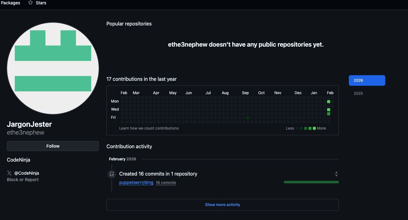 Revisiting the GitHub account used for delivering macOS malware, this closely mirrored the first malicious GitHub profile. Notably, whilst the first account was used to promote and distribute the fake Windows installer, its install command for MacOS would instead pull and run malware from a separate repository called dmg under a newly created organisation puppeteerrr, which in itself is a major red flag. Much like the first account, the second account, which created the organisation and repository, was also first opened in September, and had no public activity up until early February when the malicious organisation puppeteerrr and associated repository dmg were created.