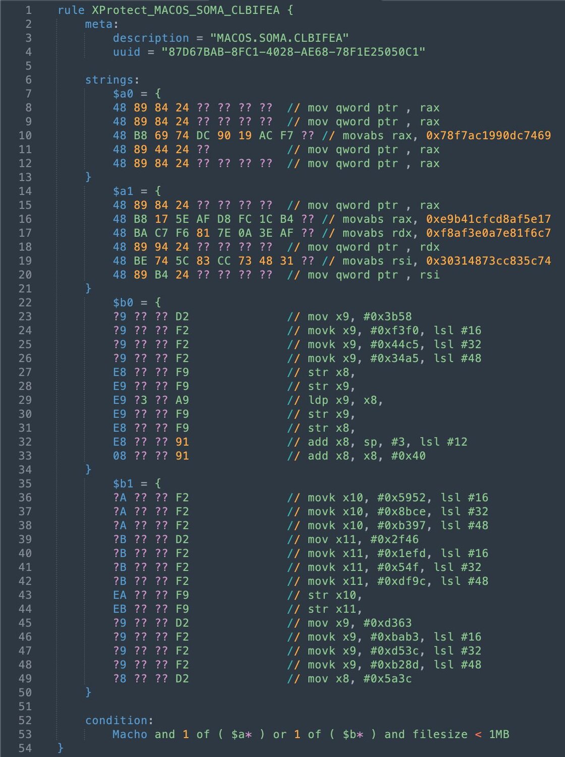 It’s worth noting that in the hours after receiving the OpenClawBot for analysis, our researchers observed that the latest updates to XProtect.yara (version: 5329) detect this file under a new rule, MACOS.SOMA.CLBIFEA. As such, it will fail to run on any macOS system with the latest XProtect rules applied.