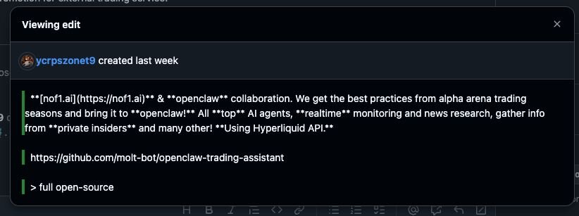 Looking at the account involved in the fake OpenClaw installer revealed that the user first joined GitHub in September of 2025. They performed no public actions until they opened an issue on the official OpenClaw repository on January 30, promoting a different GitHub repository openclaw-trading-assistant, under the organisation molt-bot. This issue was closed shortly after to remove traces of self-promotion, and an identical issue was raised before a member of OpenClaw closed it off as spam.