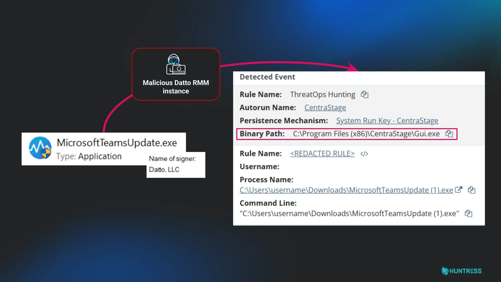 Images depict an incident shut down by the Huntress AI-centric SOC caused by a rogue Datto RMM