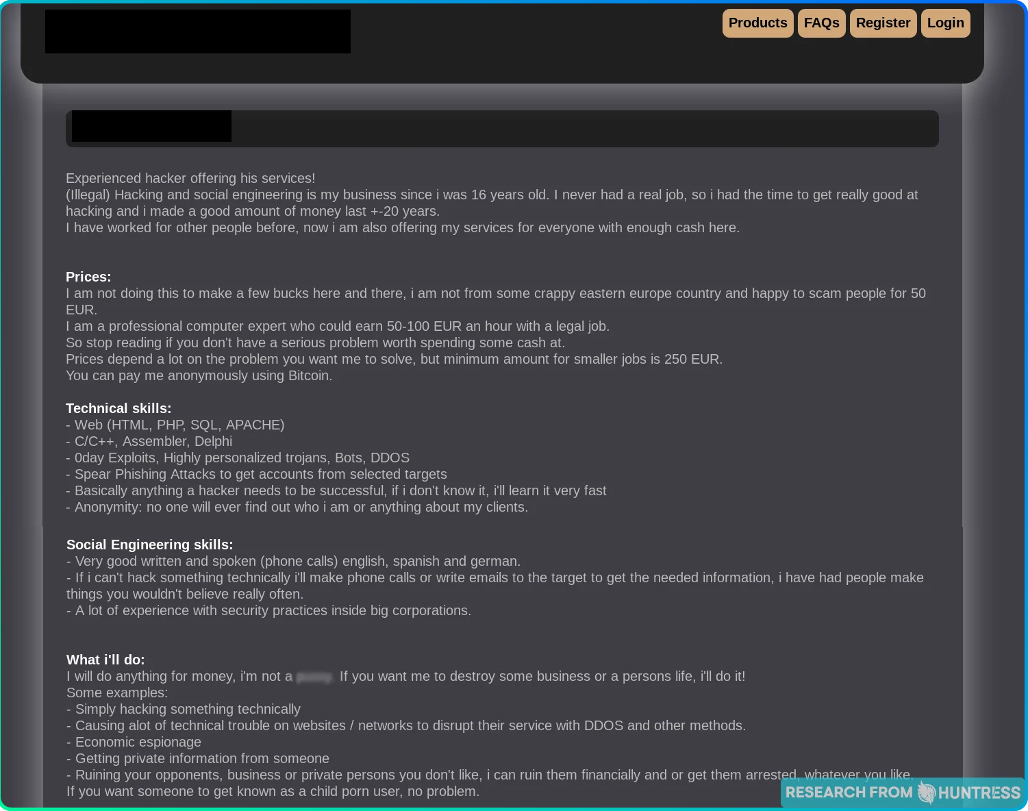Like any good businessperson, hackers aren’t shy about broadcasting what they can do if the price is right. In fact, some are so business-savvy that they provide packages and tiered solutions: