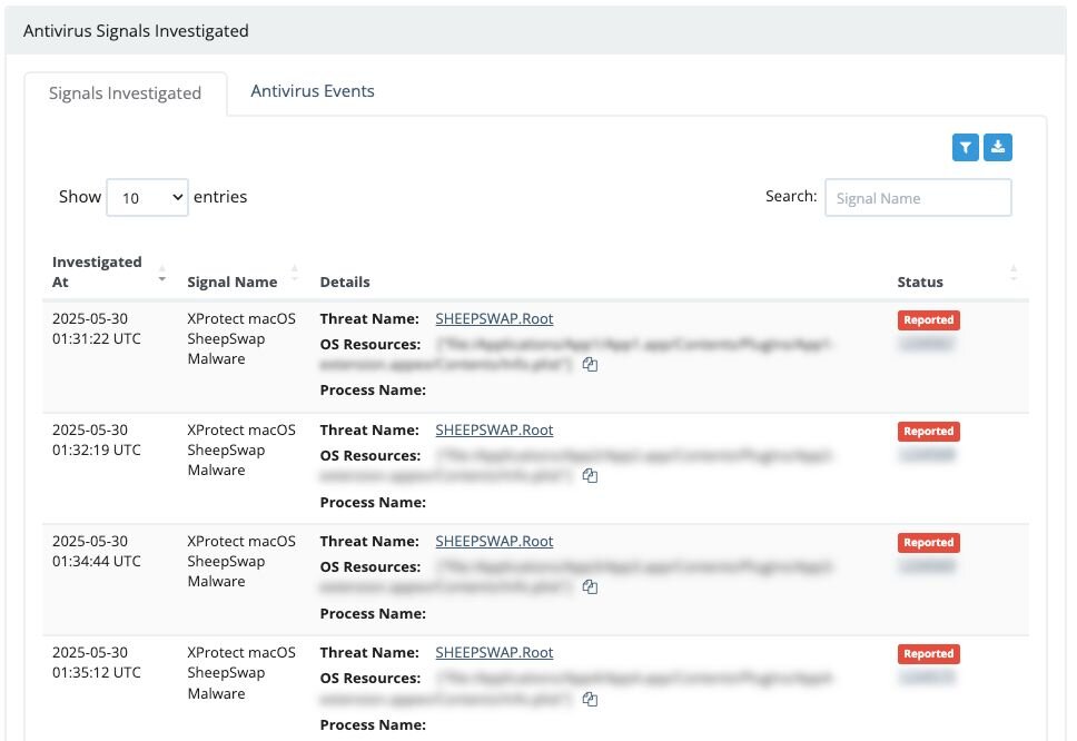 Using XProtect, Huntress can trigger high-fidelity signals for our 24/7 SOC to investigate. Signals can be seen on a new Antivirus page on the Agent detail pages in the Huntress Managed Security Platform Portal.