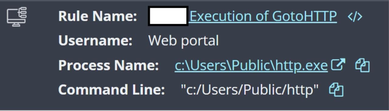 This barrier didn’t deter the threat actor: on December 8, they returned yet again, via the same means. This time, the client IP address in the web server logs was 103.36.25.171, and a renamed copy of the freely available GotoHTTP RMM tool was dropped on the endpoint.
