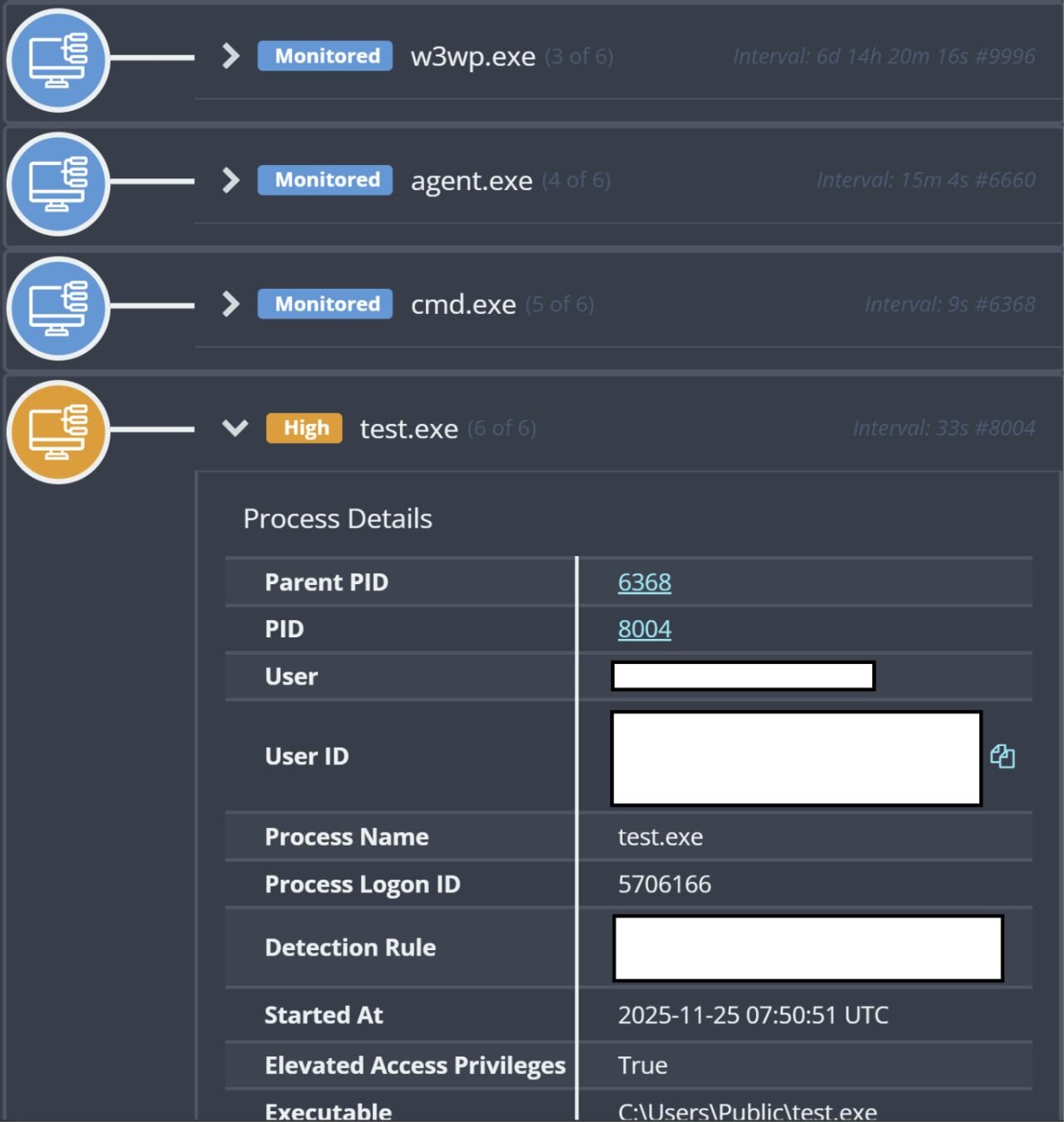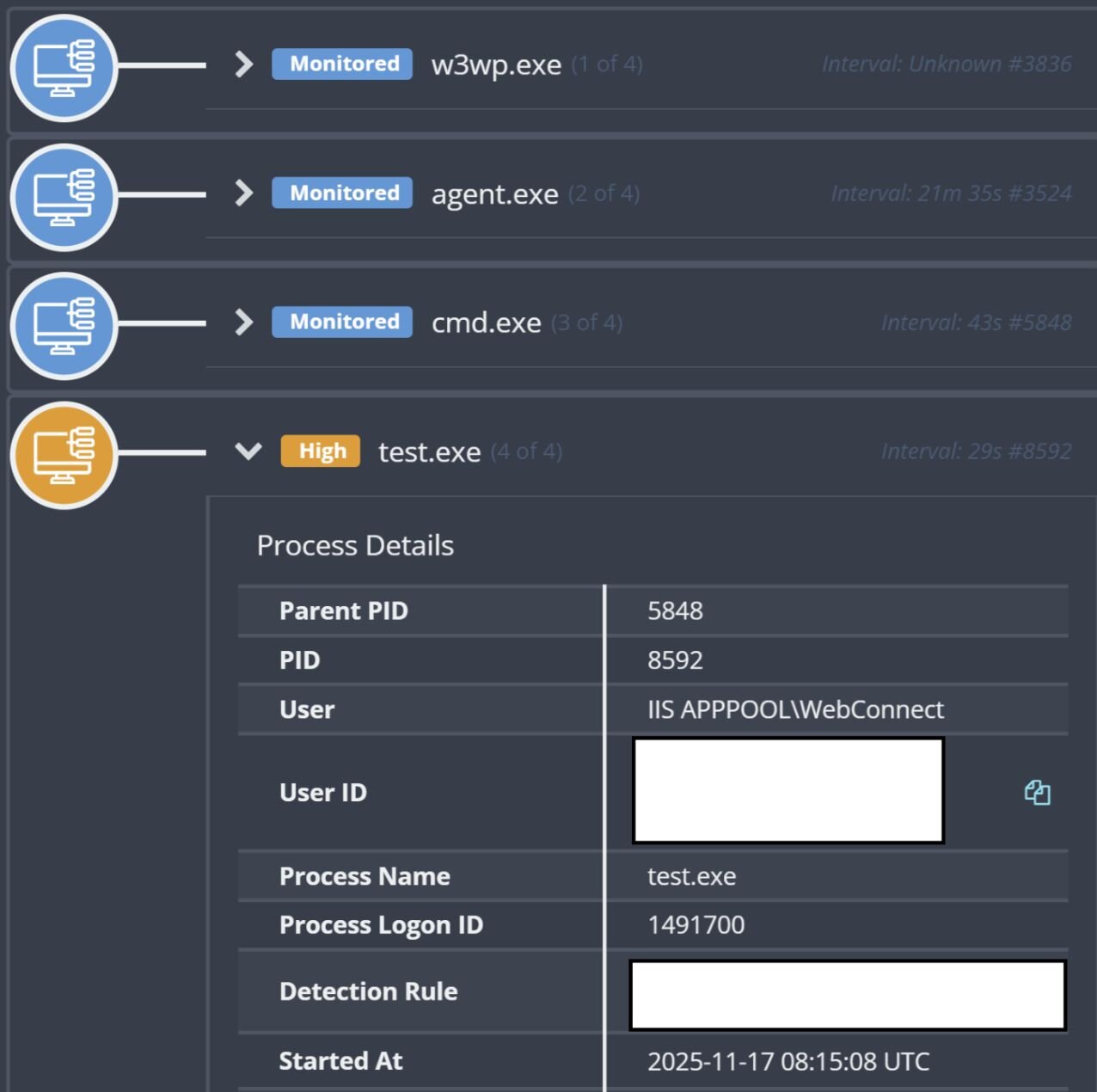 On November 25, Huntress reported an attack on an enterprise shared services organization customer that originated via the Microsoft Internet Information Server (IIS) web server process, w3wp.exe. The process tree leading to the launch of test.exe is illustrated in Figure 7.