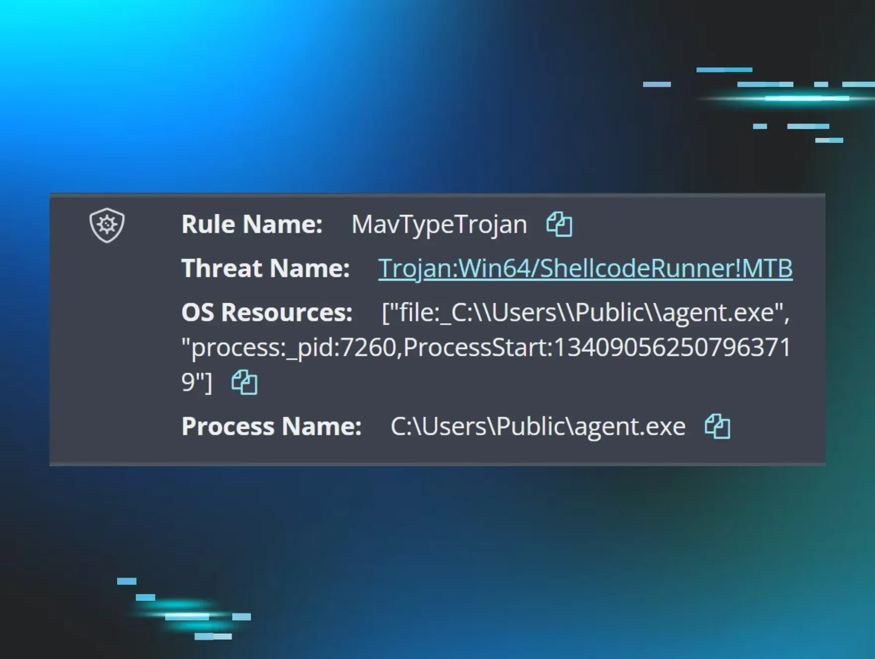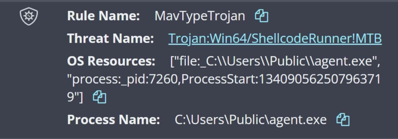Shortly after this command line was launched, logs indicate that Windows Defender identified agent.exe as a potentially unwanted application (PUA), but took no action. Then, almost 48 hours later, following a Windows Defender update, the file was detected as “ShellcodeRunner” and quarantined, as illustrated in Figure 2.