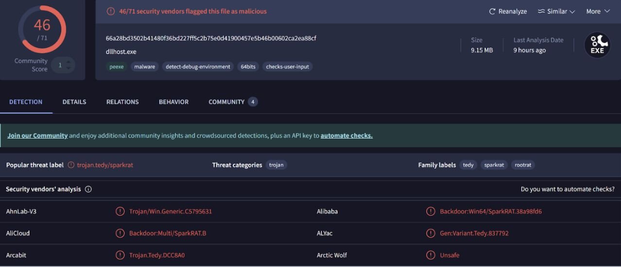Based on hash comparison, the file dllhost.exe is a copy of agent.exe, which in this incident, was identified via VirusTotal as SparkRAT.