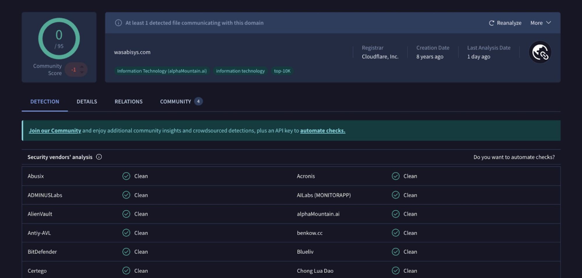 In the incident we saw, the Windows Event Log shows the threat actor compromising WSUSService.exe before running the Windows installer (as seen via a Service Control Manager/7036 message stating Windows Installer,running) and then installing a malicious MSI package from s3[.]wasabisys[.]com. Figure 1 illustrates the results of searching for the domain on VirusTotal.