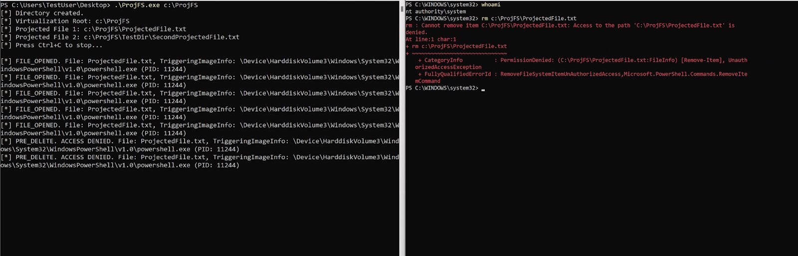 As I showed above, through the NotificationCallback there are three “pre” operations that allow for the UM provider to return a status—like ERROR_ACCESS_DENIED—PRJ_NOTIFICATION_PRE_DELETE, PRJ_NOTIFICATION_PRE_RENAME, and PRJ_NOTIFICATION_PRE_SET_HARDLINK. The one that really caught my eye was PRJ_NOTIFICATION_PRE_DELETE and made me ask the question, "As a medium IL user, can I prevent a higher context application from deleting my files?" The answer was "yes."