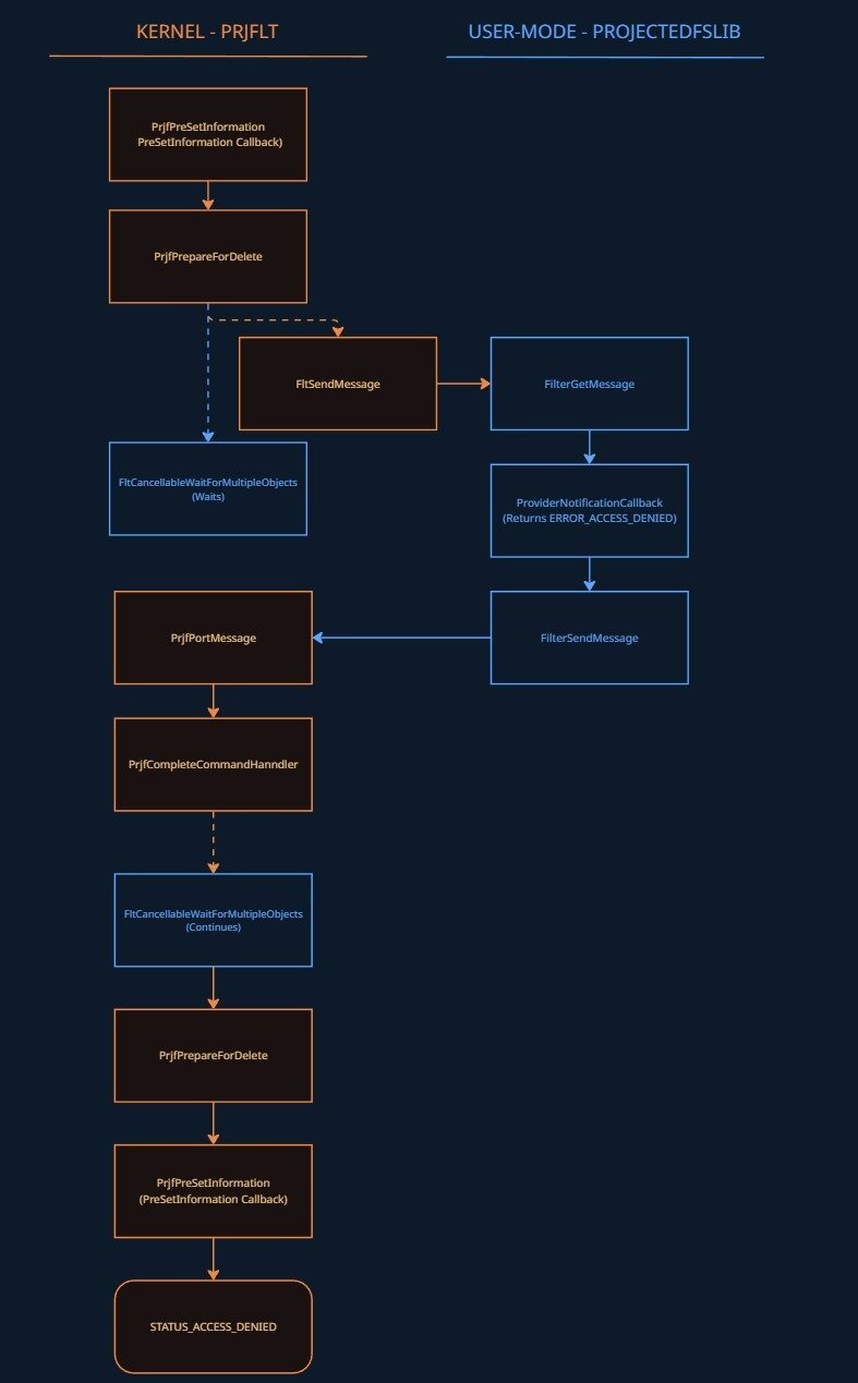 PrjfPrepareForDelete's job is to package up all the relevant information and ship it to the provider eventually through FLTMGR!FltSendMessage and received via FilterGetMessage within the function PROJECTEDFSLIB!PrjpCommandHandlerWorkerThreadProc. The message is then parsed and passed to the notification callback, where the request is processed (in our case, it returns access denied). The return value is then passed back to the minifilter via PROJECTEDFSLIB!FilterSendMessage, which triggers prjflt!PrjfPortMessage and then prjflt!PrjfCompleteCommandHandler. This signals the completion event, which wakes up FltCancellableWaitForMultipleObjects inside PrjfSendCommandAndWaitForCompletion, returning the access denied NTSTATUS, which is read and returned back up through PrjfPrepareForDelete -> PrjfPreSetDispositionInformation -> PrjfPreSetInformation, which returns it to Filter Manager and the file deletion is denied.