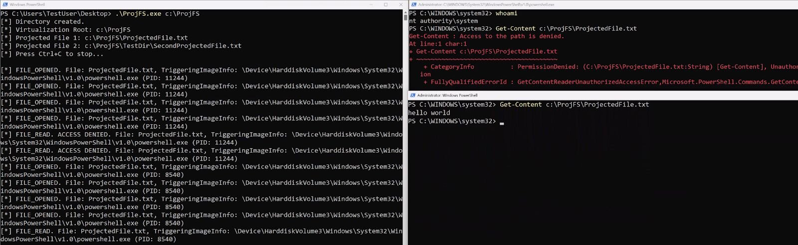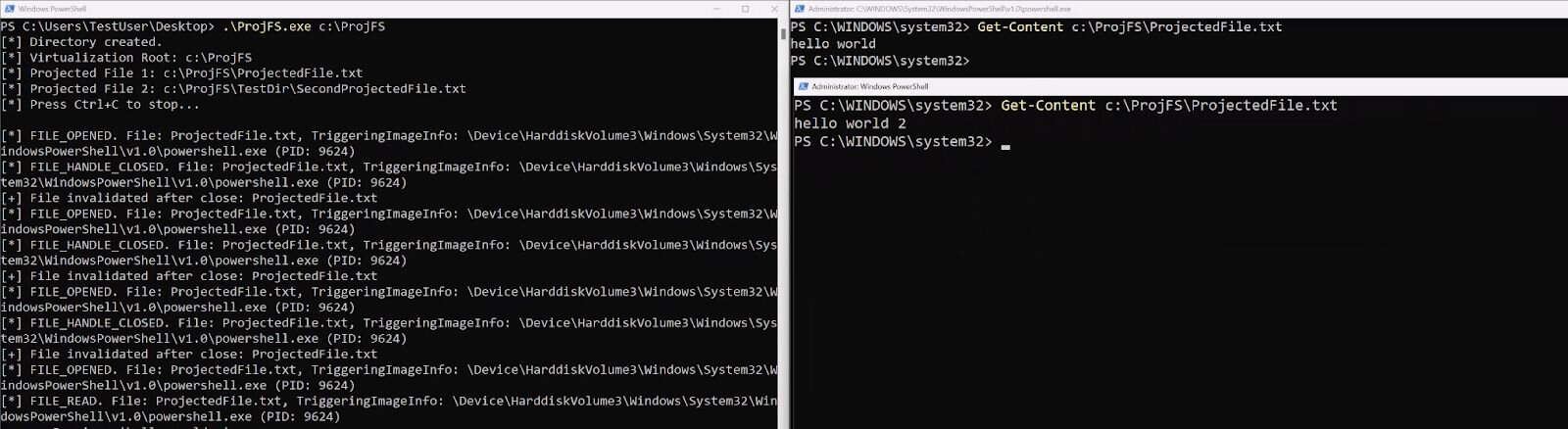 As you can see, ProjFS.exe is the ProjFS provider, C:\ProjFSDir is the virtualization root, and the monitored files are C:\ProjFSDir\ProjectedFile.txt and C:\ProjFSDir\TestDir\SecondProjectedFile.txt.