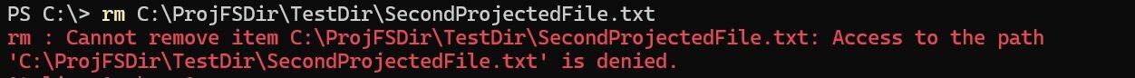 You might notice that three of these notifications, namely PRJ_NOTIFICATION_PRE_DELETE, PRJ_NOTIFICATION_PRE_RENAME, and PRJ_NOTIFICATION_PRE_SET_HARDLINK have “PRE” within their name. This correlates to a “pre” operation notification callback, which means that those notification callbacks allow you to return an error if someone tries to perform one of those operations. For example, if I try to delete C:\ProjFSDir\TestDir\SecondProjectedFile.txt, I can deny that access: