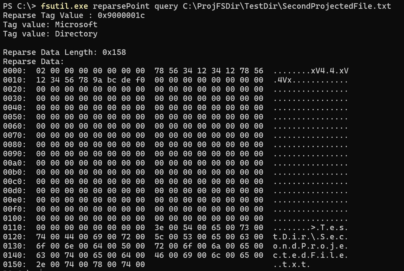 Architecturally, the ProjFS isn’t a filesystem. It's a minifilter that relies on reparse points to identify its own files/directories that were generated by the provider. For those that are not aware, reparse points are an attribute that is some predefined data that's understood by a usermode application and typically a filesystem, but in this case a minifilter. Reparse points contain a tag, an optional GUID, and the defined data. The ProjFS has two defined reparse point tags: