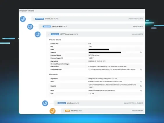 Huntress first observed exploitation on a customer on July 1, 2025, just a day after the initial write-up was published. Exploitation activity underneath the Wing FTP server process WFTPServer.exe began to ramp up at 16:15 UTC and is further detailed in our technical analysis below.
