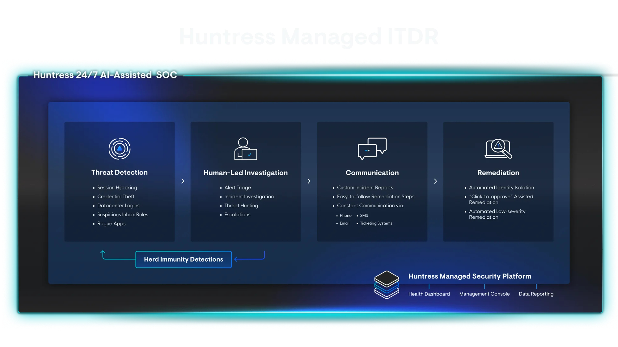 Only Huntress gives you visibility, validation, and remediation. We don’t just alert–we respond, with SOC-backed action and clear guidance for remediation.
