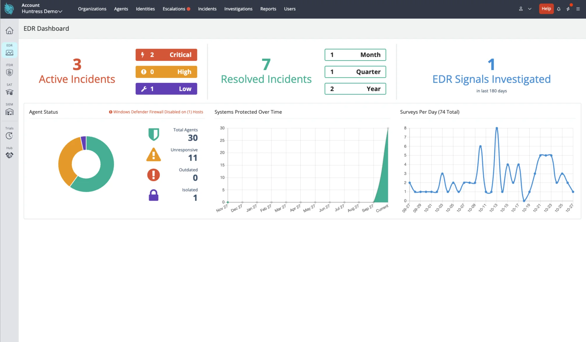 The Huntress dashboard combines the power of our Managed Security Platform and 24/7 Security Operations Center (SOC), giving you a complete view of your organization. From your dashboard, you get immediate access to: