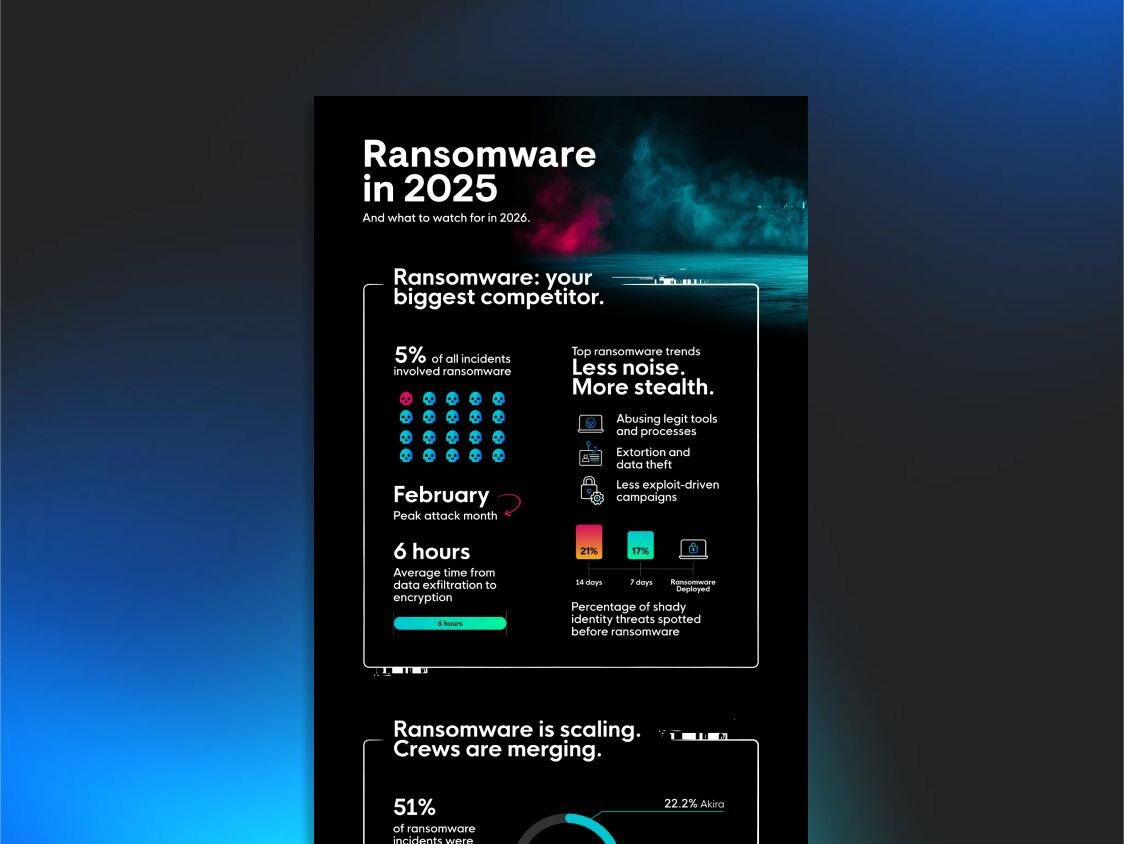 The Huntress 2026 Cyber Threat Report breaks down the details of ransomware threat activity we tracked in 2025. But if you’re looking for the TL;DR, this infographic serves up the essentials you need to level up your game plan against ransomware.