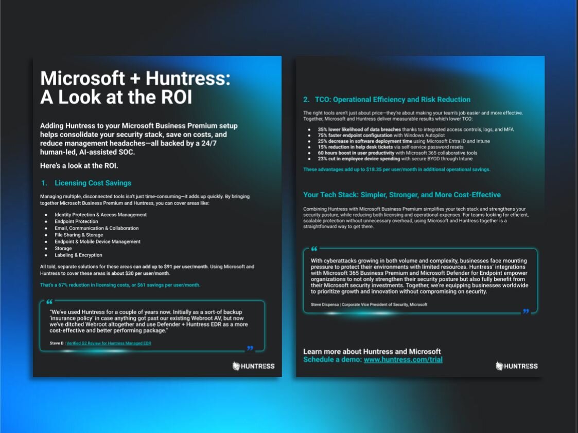 Book a personalized demo to look at Huntress under the hood, explore the dashboard, and ask questions to our experts.